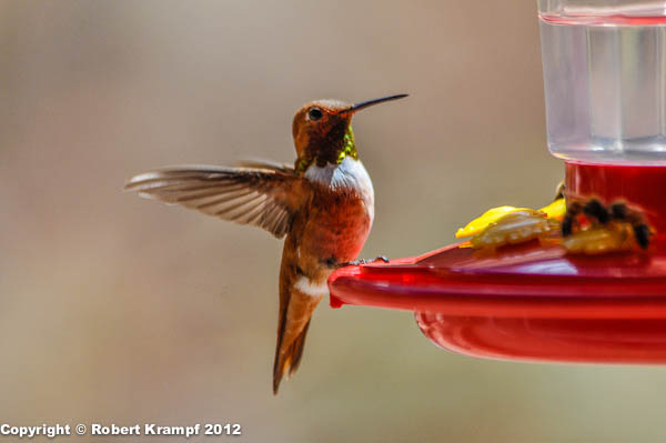 Seconds after I took the previous photo, I took this one of the same bird. Notice that the Hummingbird's throat has changed color from bright red to bright green. How does this happen?