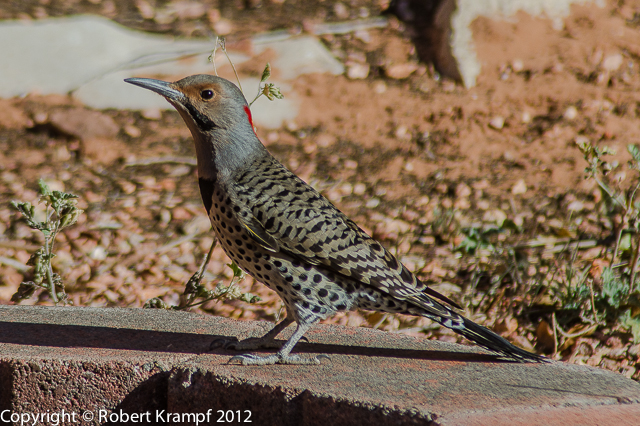 This is a Northern Flicker. There are two major subspecies, the Yellow-Shafted Northern Flicker and the Red-Shafted Northern Flicker. Yellow-Shafted Northern Flickers are usually found east of the Rockies, while Red-Shafted Northern Flickers are found west of the Rockies. Their names come from the color of their feather shafts, but you can also identify the males by their malar stripe, the mustache-like stripe on its face. Yellow-Shafted Northern Flickers have a black malar stripe while Red-Shafted Northern Flickers have red malar stripes. This is a Yellow-Shafted Northern Flicker, and it a long way from its normal territory.