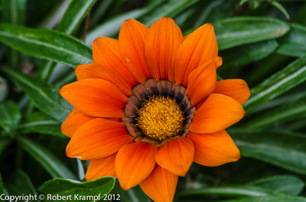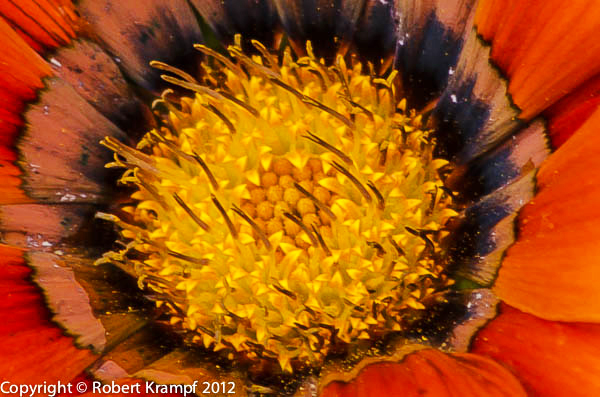 This plant is a Gazania, a member of the Aster family. They have composite flowers, which means that what appears to be a single flower is actually a cluster of flowers. Each of the large, colorful petals is a separate flower known as a ray flower. The center is made up of many small disk flowers, each with five small petals. That means that there are a LOT of petals in the photograph.