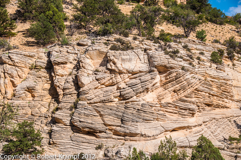 This is a layer of rock known as the Navajo Sandstone. The angles lines are called cross-bedding, and they were formed by sand dunes. As the wind blows sand up the dune, it slides down the opposite side, making repeated layers. You can see exactly the same patterns in the dunes of modern deserts. The Navajo Sandstone extends over 100,000 square miles, telling us that during Jurassic times, this area looked much like the modern Sahara Desert.