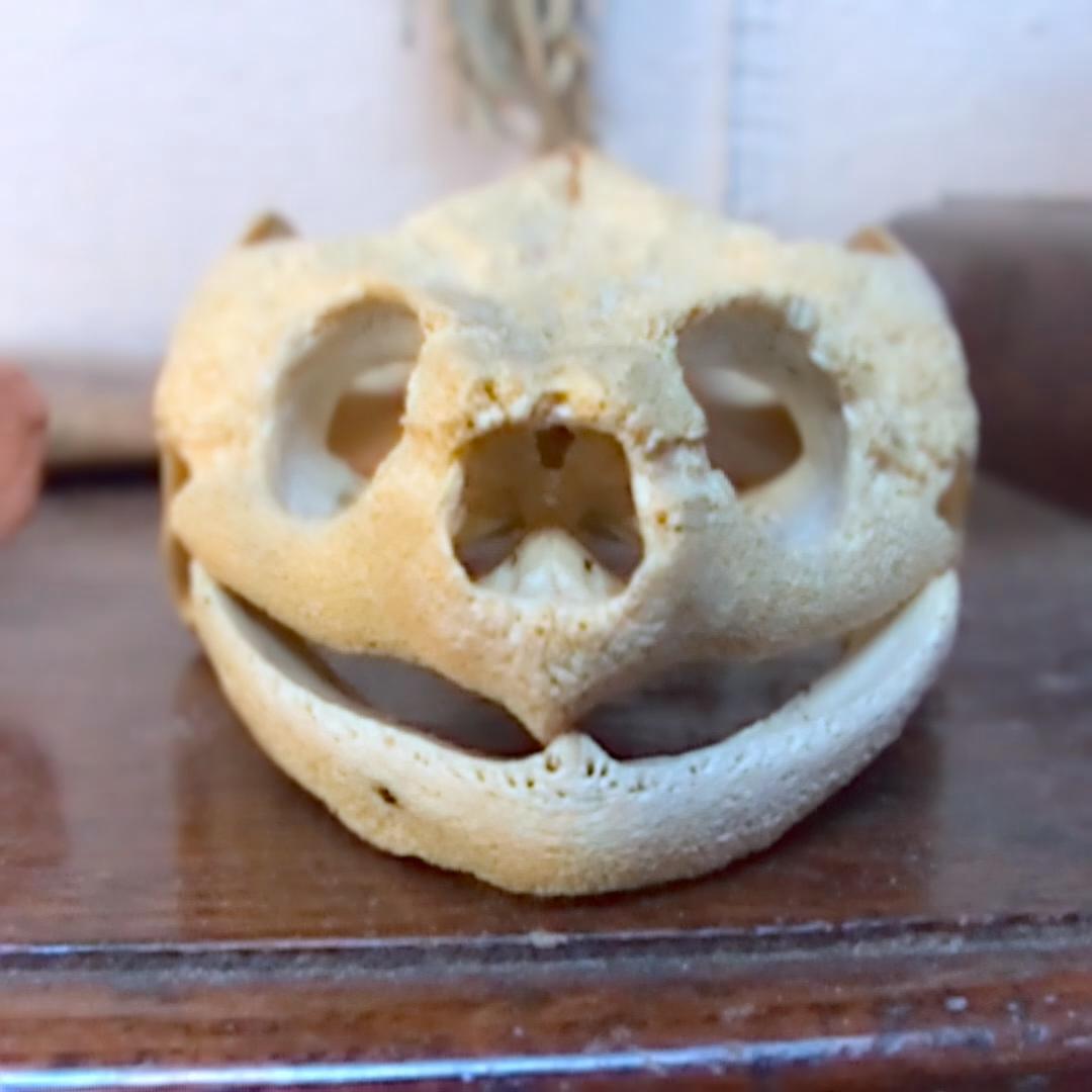 This is the skull of a common snapping turtle. Notice that the jaws are beak-like with no teeth, and that the skull is covered with rough, dermal bone. The alligator snapping turtle has a broader skull, and a much more hooked beak.