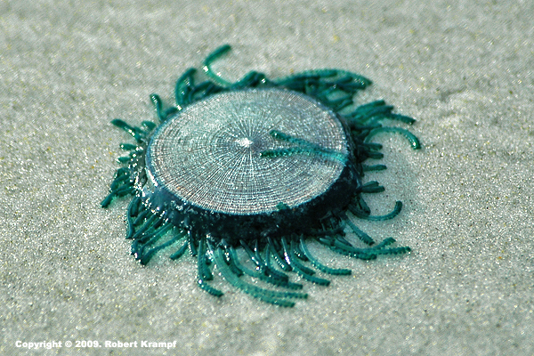 This is a Blue Button, a type of colonial hydrozoan related to the Portuguese Man-o-War. While it looks like a jellyfish, it is actually a colony of tiny creatures attached to the chitinous disc, which is hollow and filled with air to let the colony float. It does have stinging cells, which can be irritating, but are not dangerous to people. It is very similar to Velella velella, the by-the-wind sailor, but it does not have the small sail like the sailor.